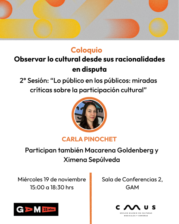 “Lo público en los públicos: miradas críticas sobre la participación cultural” es el nombre de la segunda sesión del coloquio del Centro Cultural GAM Observar lo cultural desde sus racionalidades en disputa y que se llevará a cabo este miércoles 19 de noviembre. Este panel estará conformado por Carla Pinochet, nuestra directora alterna; Macarena Goldenberg, curadora y coordinadora de Programas Públicos del Museo de la Solidaridad Salvador Allende; y Ximena Sepúlveda, integrante del Comedor Popular Margarita Ancacoy.