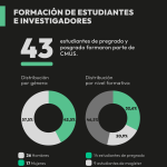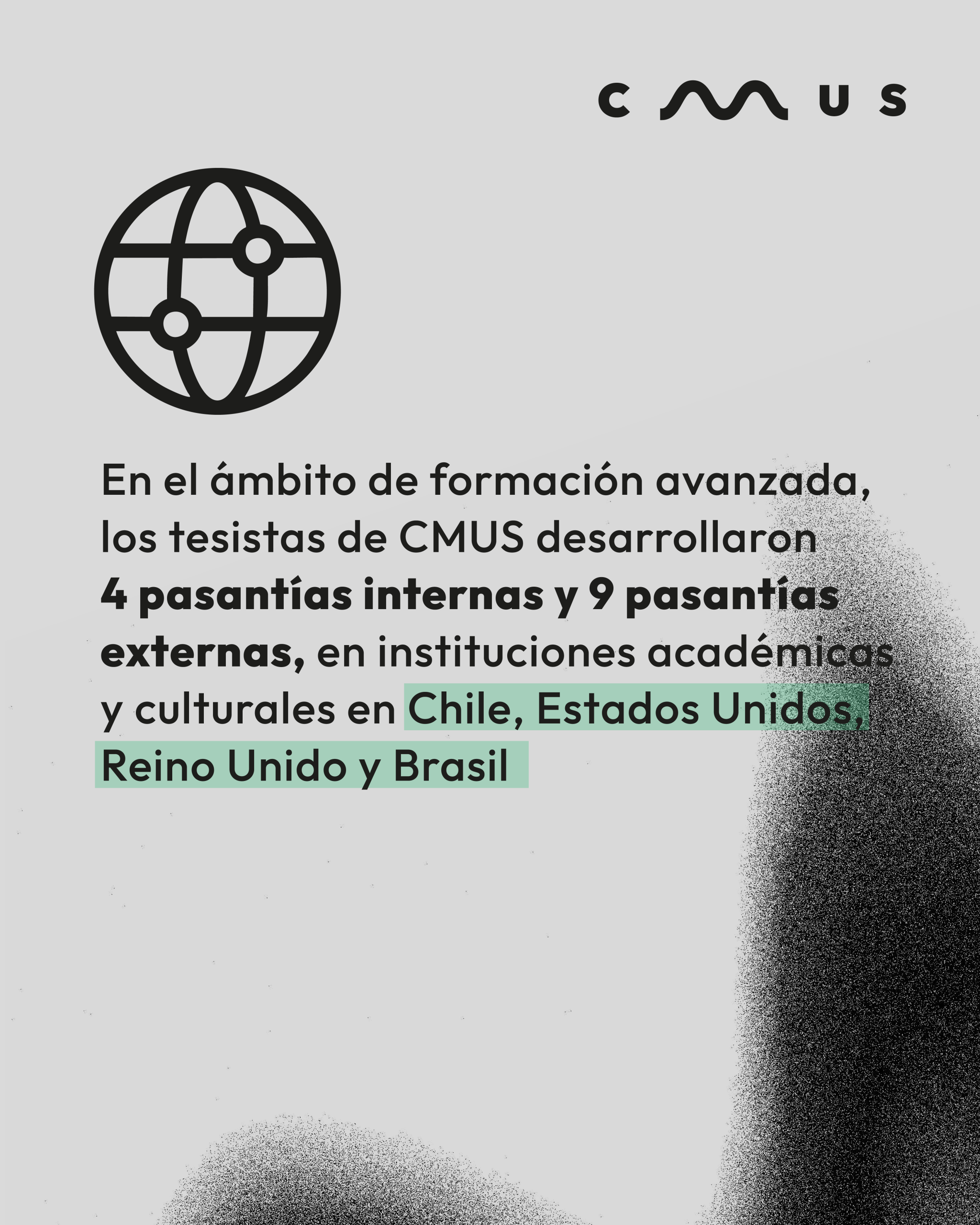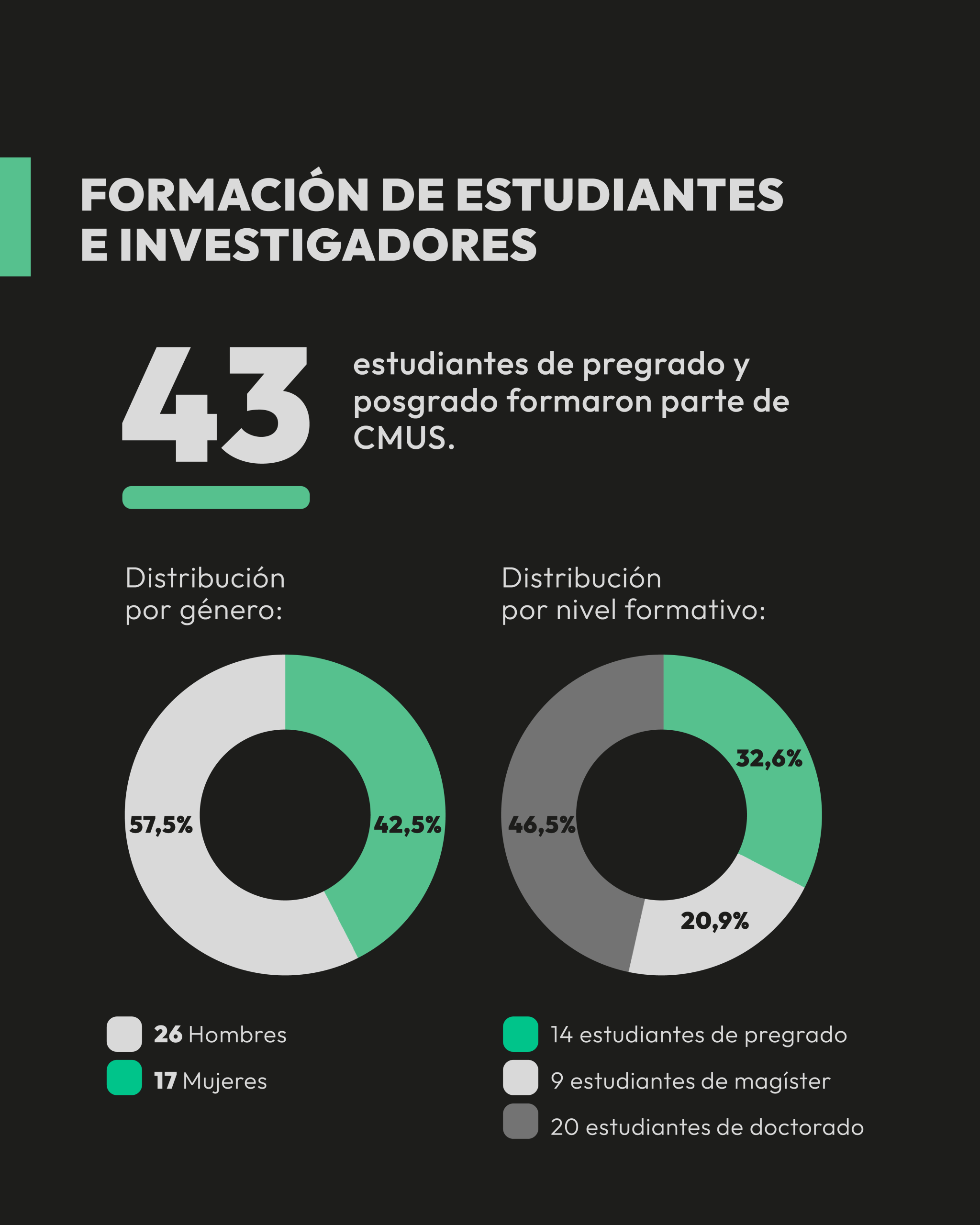 43 estudiantes de pregrado y posgrado formaron parte de CMUS, de los cuales 17 eran mujeres y 26 hombres. En cuanto a su nivel formativo 14 eran estudiantes de pregrado, 9 de magíster y 20 de doctorado. En el ámbito de la formación avanzada, se desarrollaron 4 pasantías internas y 9 pasantías externas, en instituciones académicas y culturales en Chile, Estados Unidos, Reino Unido y Brasil.