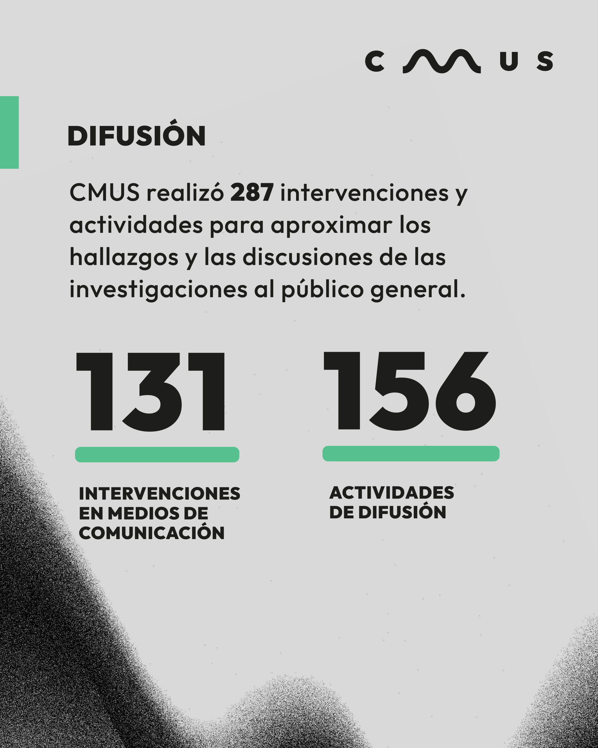 El Programa de Comunicaciones de CMUS se constituyó a partir de la actualización de noticias en su sitio web, Newsletter mensual, redes sociales y el propio canal de Youtube. Durante 2024 y 2025 esta estructura se fortaleció con una mayor circulación de contenidos y con la visibilidad alcanzada por entrevistas, columnas, notas de prensa y cobertura en medios nacionales e internacionales en diarios como El País, Ciper e Interferencia, entre otros que en total se sumaron 131 apariciones.