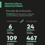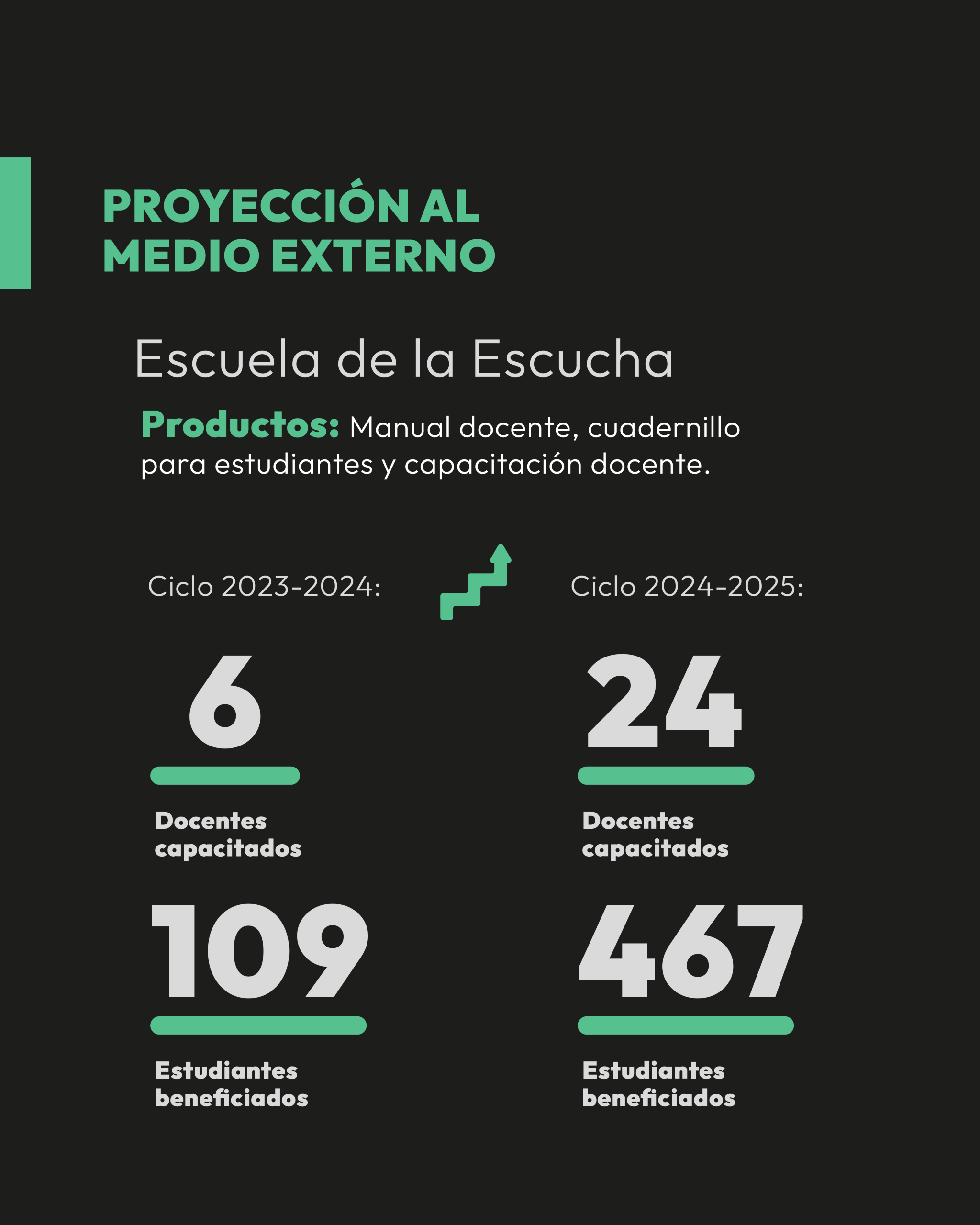El segundo ciclo (2024-2025), significó una ampliación muy relevante de escala, cobertura y resultados. Esta versión de La Escuela de la Escucha capacitó a 24 docentes e implementó 22 talleres en diez regiones del país, alcanzando a 467 estudiantes de enseñanza media. Además, produjo seis cápsulas audiovisuales de acceso abierto y desarrolló un proceso de evaluación mediante encuestas y análisis cualitativo. En términos de innovación, La Escuela de la Escucha fue especialmente relevante porque transformó un campo de investigación aún poco presente en la educación escolar —los estudios del sonido y la escucha— en una propuesta pedagógica concreta, abierta, replicable y territorialmente diversa.
