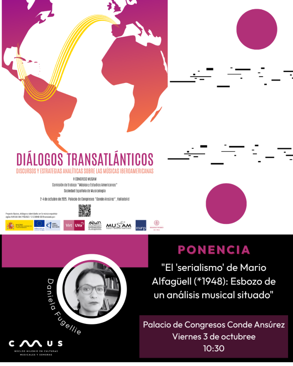 Daniela Fugellie participará en el V Congreso MUSAM Diálogos transatlánticos discursos y estrategias analíticas sobre las músicas iberoamericanas organizado por la Universidad de Valladolid entre el 2 y 4 de octubre. El evento tendrá lugar en el Palacio de Congresos Conde Ansúrez, edificio de la misma institución. La investigadora principal de CMUS dará la ponencia «El ‘serialismo’ de Mario Alfagüell (*1948): Esbozo de un análisis musical situado».