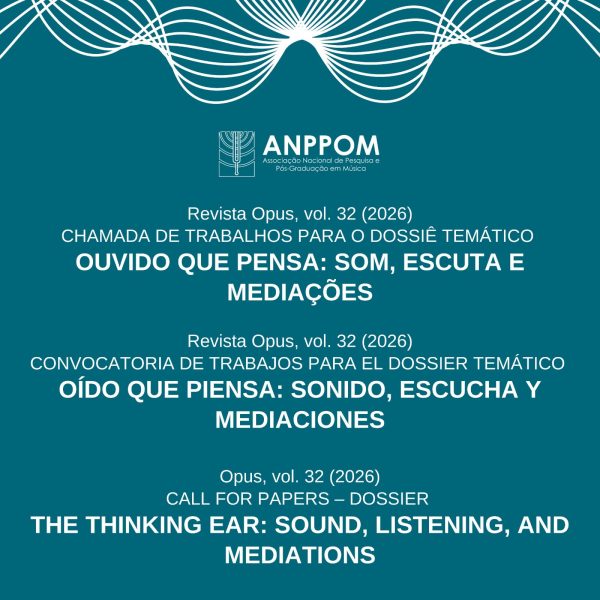 The journal Opus, in its 32nd volume, is accepting submissions for the dossier “Thinking Ear: Sound, Listening, and Mediations,” edited by Beatriz Medeiros (Postdoctoral Researcher at CMUS/Universidad Mayor, Chile); Luiz Ribeiro Fonseca (Loughborough University London, United Kingdom); and Marcelo Reis Filho (UERJ, Brazil). The deadline for submissions is March 31, 2026, and the acceptance results will be announced on July 10, 2026.