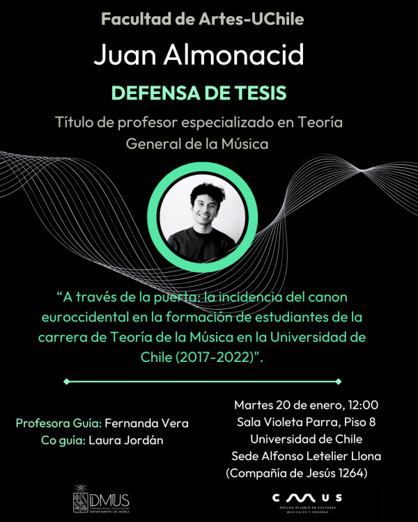 Juan Almonacid, one of the CMUS thesis students, will defend his dissertation tomorrow, January 20th, for the title of Professor specializing in General Music Theory at the Faculty of Arts of the University of Chile. His work, entitled “Through the Door: The Impact of the Euro-Western Canon on the Training of Music Theory Students at the University of Chile (2017-2022),” was supervised by Dr. Fernanda Vera, while Laura Jordán, principal investigator of the Center, served as co-advisor.