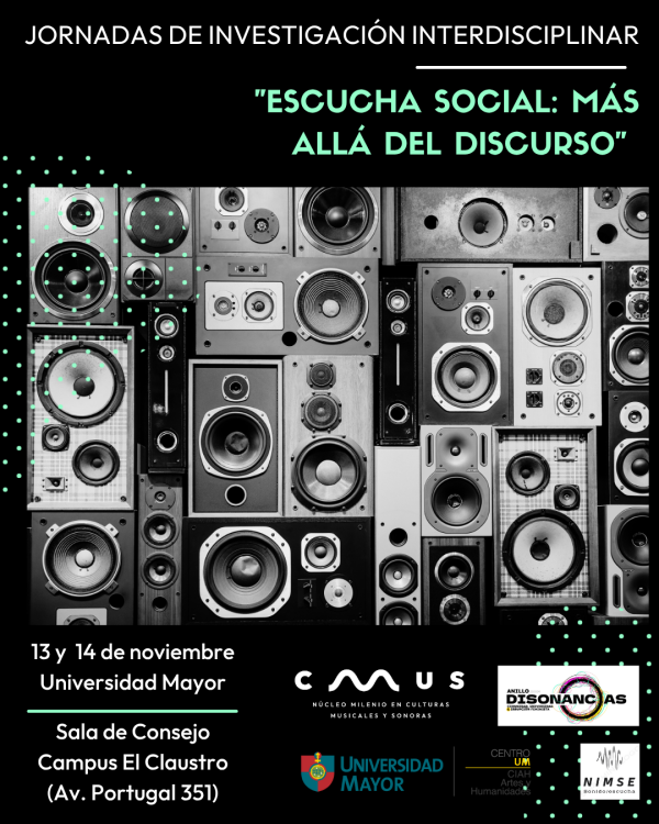 Este jueves 13 y viernes 14 de noviembre tendrán lugar en la Universidad Mayor las Jornada de estudio Más allá del discurso. Escucha Social, Métodos y desafíos, que cuenta con la coordinación de la investigadora adjunta de CMUS y académica de la Universidad Mayor, Natalia Bieletto y Sandra Vera Gajardo, académica de la Universidad Alberto Hurtado. El encuentro tendrá invitados internacionales como Alejandro Castillejo Cuéllar y Juan Ángel Agudelo de Colombia, más Maryam Adja de Estados Unidos y Salvador Brioso de México. Los exponentes chilenos provienen además de diferentes instituciones y disciplinas dentro de las humanidades, lo que le da una amplia variedad de perspectiva al diálogo.