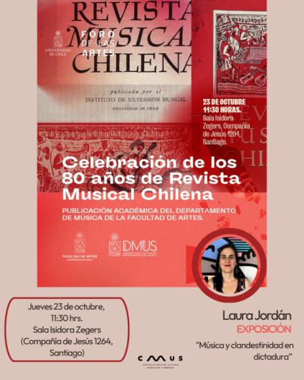 La Revista Musical Chilena celebra este jueves 23 de octubre sus 80 años. Laura Jordán será una de las expositoras del encuentro en el cual hablará sobre su artículo «Música y clandestinidad en dictadura», publicado en RMCH en 2009. Según la investigadora principal de CMUS es hasta hoy uno de los más consultados según las estadísticas que arroja la plataforma web. Esto se enmarcará en los avances del «FONDECYT Culturas del casete: tecnología, escucha y participación»