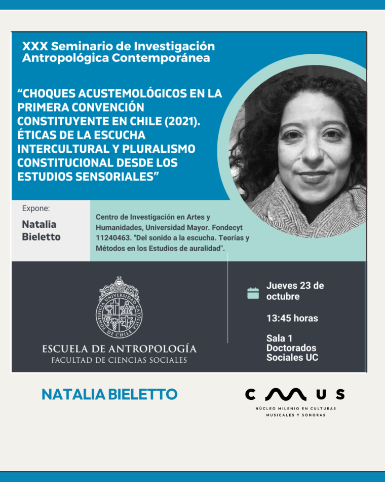 Este jueves 23 de octubre, Natalia Bieletto dará la conferencia «Choques Acustemológicos en la primera Convención Constituyente en Chile (2021). Éticas de la Escucha Intercultural y Pluralismo Constitucional desde los Estudios Aurales” en la Escuela de Antropología PUC. La actividad es parte del XXX Seminario de Investigación Antropológica Contemporánea.