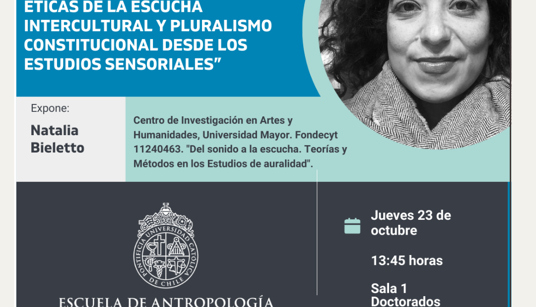 Este jueves 23 de octubre, Natalia Bieletto dará la conferencia «Choques Acustemológicos en la primera Convención Constituyente en Chile (2021). Éticas de la Escucha Intercultural y Pluralismo Constitucional desde los Estudios Aurales” en la Escuela de Antropología PUC. La actividad es ...
